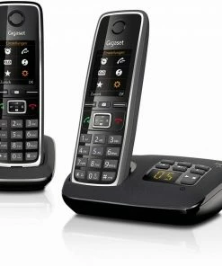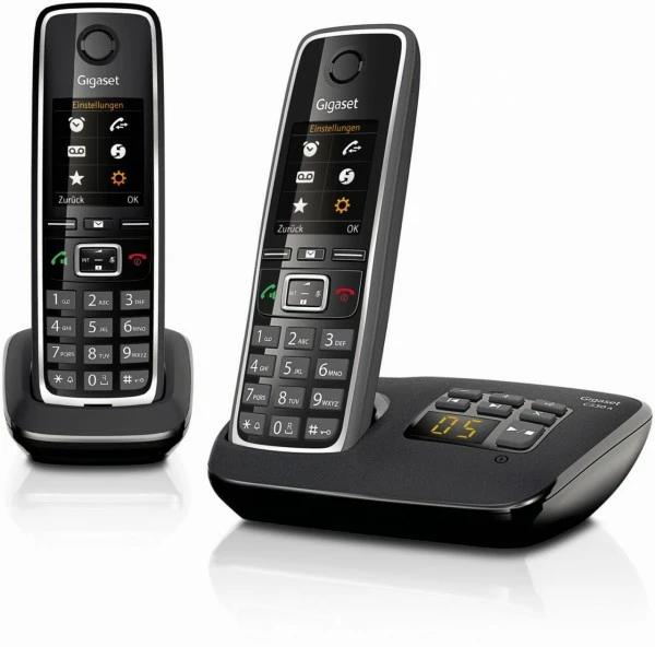 Das Gigaset C530A Duo ist ein Set aus zwei Schnurlostelefonen inklusive Anrufbeantworterfunktion. Der Anrufbeantworter bietet 30 Minuten Aufzeichnungszeit. Eingehende Telefonnummern sind auf dem großen und beleuchteten TFT-Display gut ablesbar. Dank der brillanten Audioqualität mit HighSound Performance sind Gesprächspartner gut zu verstehen. Im integrierten Adressbuch finden bis zu 200 Einträge Platz.