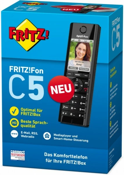 Das FRITZ!Fon C5 von AVM ist ein schnurloses DECT-Telefon, welches für alle FRITZ!Boxen mit DECT-Basisstation des Herstellers optimiert ist, aber natürlich auch an anderen Routern funktioniert. Mit dem FRITZ!Fon C5 erleben Sie brillante IP-Telefonie in HD-Qualität. Koppeln Sie das Telefon mit einer FRITZ!Box, sind zahlreiche Funktionen verfügbar. So können Sie zum Beispiel mit dem Telefon das WLAN ausschalten oder Smarthome-Geröte steuern. Zu den weiteren Komfortmerkmalen gehören das hochauflösende Display mit 180 ppi, die Tastenbeleuchtung, verschiedene Kurzwahltasten, Anrufbeantworter, Klingeltöne sowie ein Telefonbuch für knapp 300 Einträge.