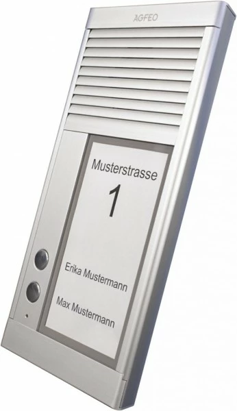 Das flache Aluminium-Gehäuse ist 22 mm tief, mit einem Klingeltaster ausgestattet und für die Aufputzmontage vorgesehen. Das beleuchtete große Klingelschild (165 x 127 mm) bietet viel Platz für die eigene Gestaltung. Die AGFEO DoorSpeak 2 ist dank vorprogrammierter Klingeltaster optimal auf AGFEO ES-Systeme abgestimmt (Plug`n`Play).