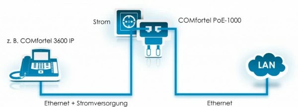 Mit den Auerswald PoE-Injector COMfortel PoE-1000 für Gigabit-Ethernet-Geräte kann ein IEEE 802.3af kompatibles Netzwerkgerät, z. B. ein Wireless Access Point, ein IP-Telefon oder eine Netzwerkkamera, direkt über die Netzwerkleitung mit Strom versorgt werden.